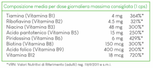 Agente di carica: cellulosa microcristallina; antiagglomeranti: talco, magnesio stearato vegetale, Costituente della capsula: idrossi-propil-metilcellulosa; Vitamina B3 o PP (Niacinamide), Vitamina B5 (Calciopantotenato), Vitamina B6 piridossina cloridrato, Vitamina B2 riboflavina, Vitamina B1 tiamina cloridrato, Vitamina B9 (acido folico), Vitamina B8 biotina, Vitamina B12 cianocobalamina. No glutine. No zuccheri aggiunti