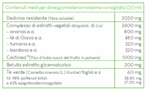 Acqua, stabilizzante: glicerolo; destrina resistente (fibra solubile da amido di mais), complesso di estratti vegetali acquosi in rapporto D/E 1:2 di: ananas (Ananas comosus (L.) Merr.) stipiti, tè di Giava (Orthosiphon aristatus (Blume) Miq.) foglia, fumaria (Fumaria officinalis L.) parte aerea, bardana (Arctium lappa L.) radice; CactineaTM (fico d’India (Opuntia ficus-indica (L.) Mill.) succo del frutto polvere), acidificante: acido citrico; aromi, betulla (Betula pendula Roth.) linfa estratto gliceroalcolico (stabilizzante: glicerolo; alcol etilico) in rapporto D/E 1:3, Tè verde (Camellia sinensis (L.) Kuntze) foglia e.s. tit. 98% polifenoli totali e 45% epigallocatechinagallato, conservante: sorbato di potassio; edulcorante: glicosidi steviolici. *CactineaTM è un trademark di Nexira. No glutine