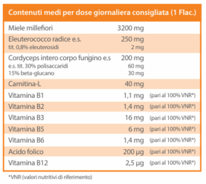 Acqua, Miele Millefiori, Eleuterococco (Eleutherococcus senticosus (Rupr. Et Maxim.) Maxim) radice e.s. tit. 0,8% eleuterosidi, Cordyceps (Cordyceps sinensis (Berk.) Sacc.) intero corpo fungino e.s. tit. 30% polisaccaridi tit. 15% betaglucano, Carnitina-L, Acidificante: Acido lattico, Conservante: Sodio benzoato, Vitamina B3 (Niacina), Aroma, Addensante: Gomma di Xantano, Vitamina B5 (Ca D- pantotenato), Vitamina B6 (Piridossina Cloridrato), Vitamina B2 (Riboflavina), Vitamina B1 (Tiamina Cloridrato), Vitamina B9 (Acido folico), Vitamina B12 (Cianocobalamina). No glutine