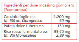 Ingredienti: Carciofo foglie est. sec. (Cynara scolymus L.) tit. 5% Acido Clorogenico, Agente di carica: Cellulosa microcristallina; Patata dolce tubero est. sec. (Ipomoea batatas (L.) Poir), RICE-KOLIN ™- Riso rosso fermentato seme est. sec. (Monascus purpureus) tit. 3% Monacoline, Agenti antiagglomeranti: Biossido di silicio, Sali di magnesio degli acidi grassi, Agenti di rivestimento: PEG, Idrossipropilmetilcellulosa. No glutine
