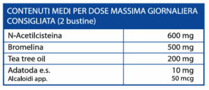 Fruttosio, N-Acetilcisteina, Bromelina 2500 GDU/g, Tea tree olio microincapsulato (Melaleuca alternifolia (Maiden & Betche) Cheel), Aromi, Agenti antiagglomeranti: Biossido di silicio; Edulcorante: Sucralosio; Colorante: Clorofilla; Adatoda foglie est. sec. (Justicia adhatoda L.) tit. 0,5% Alcaloidi.